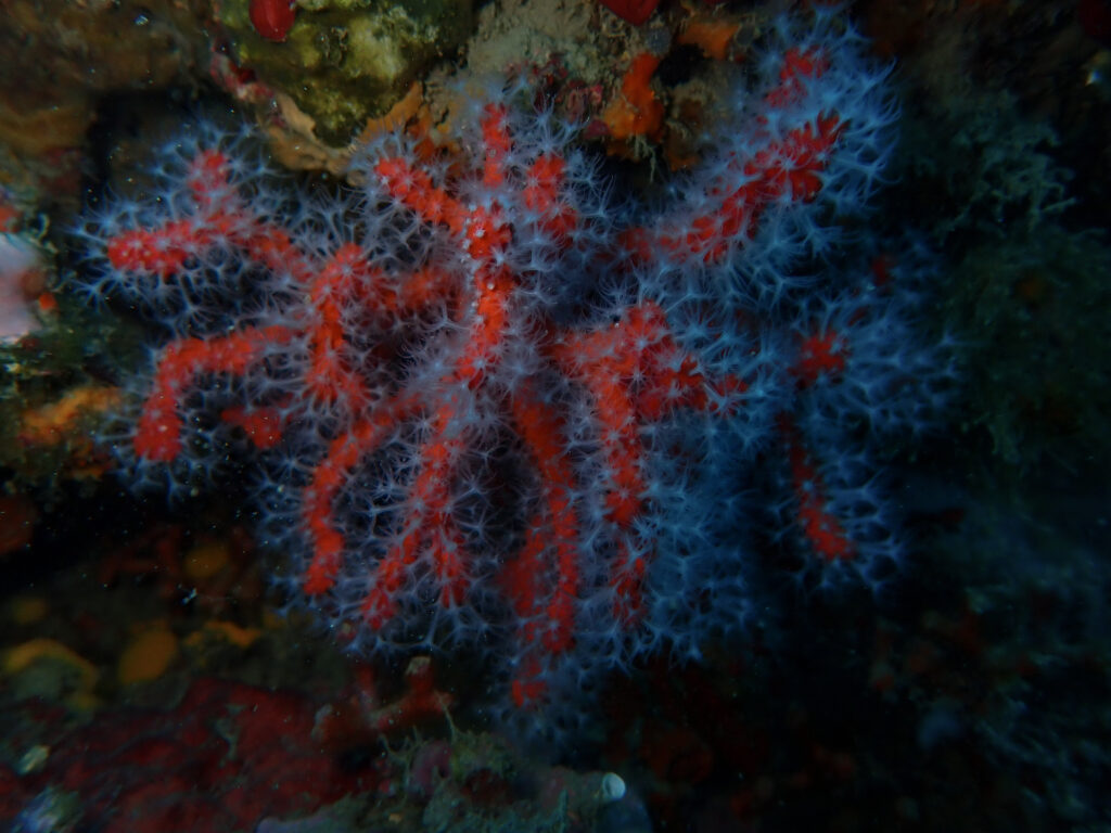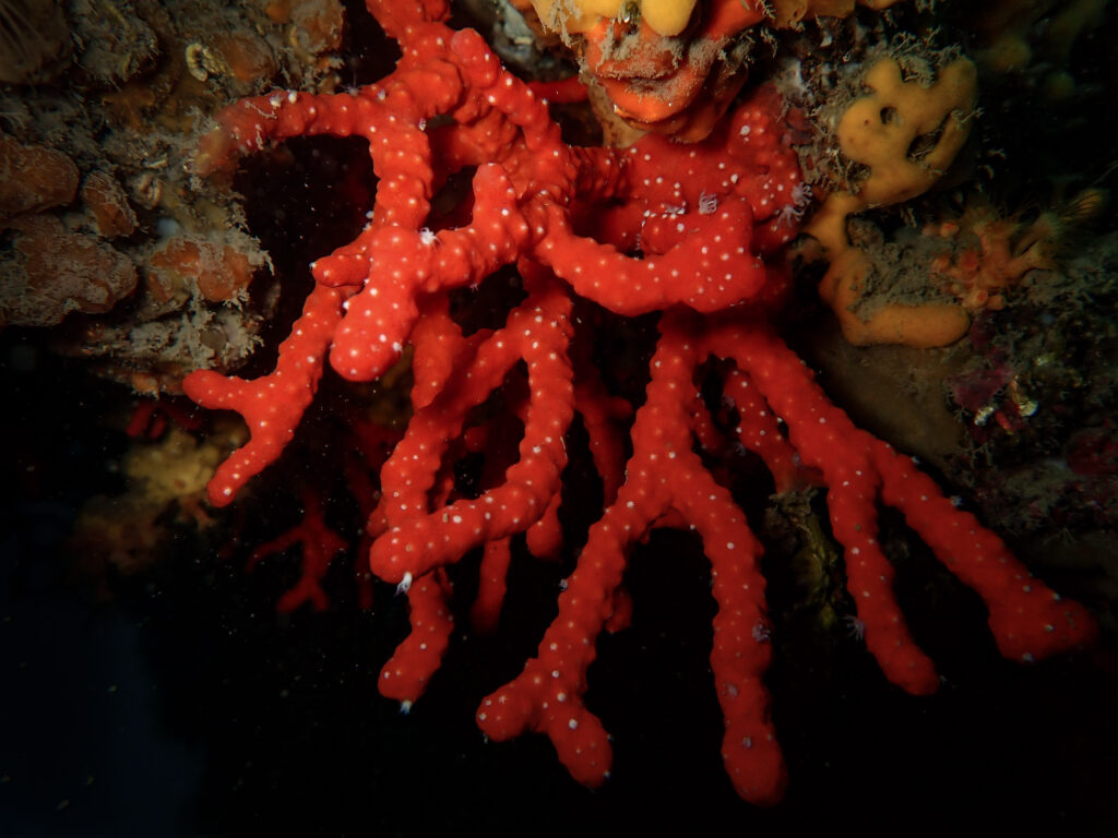 Au sein de cet habitat, le corail rouge (Corallium rubrum) joue un rôle particulier car il participe à la stratification “arborescente” du coralligène : ses colonies ramifiées augmentent la rugosité et l’encombrement, fournissent des refuges et des surfaces d’installation, et renforcent ainsi la complexité d’habitat qui conditionne l’abondance et la diversité d’organismes associés. Son importance est accentuée par ses traits d’histoire de vie : espèce longévive, à croissance lente et à dynamiques de recrutement variables, ce qui implique une faible résilience et des temps de récupération longs après perturbation ou exploitation (Garrabou & Harmelin, 2002 ; Bramanti et al., 2005). De plus, comme d’autres gorgones et organismes structurants du coralligène, C. rubrum et les communautés qui l’hébergent peuvent être affectés par les vagues de chaleur marines, responsables d’épisodes de mortalités massives à l’échelle régionale, ce qui renforce son intérêt comme espèce clé et indicatrice de vulnérabilité des habitats méditerranéens (Garrabou et al., 2009 ; Garrabou et al., 2022).